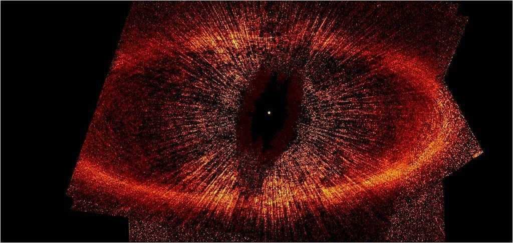 Глядя на изображение ниже, сразу вспоминается Око Саурона из известного фильма «Властелин колец». В действительности это фото звездной системы Фомальгаут. В инфракрасном диапазоне можно увидеть кольца из щебня, пыли и газа. Именно они придают картине жуткий вид.
