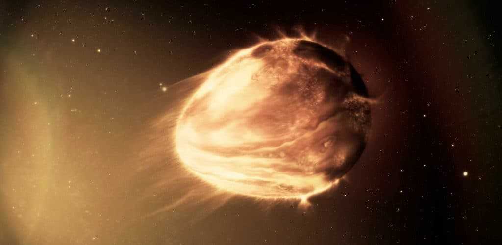 Wasp 12 b – это экзопланета, которую «пожирает» ее же звезда. Она высасывает около 189 квадриллионов т материи в год. Странно видеть космическое тело, вытянутую в такую форму, но именно так действует гравитация. По оценкам, Wasp 12 b осталось жить всего 10 млн. лет, а затем она будет полностью разорвана и поглощена солнцем.