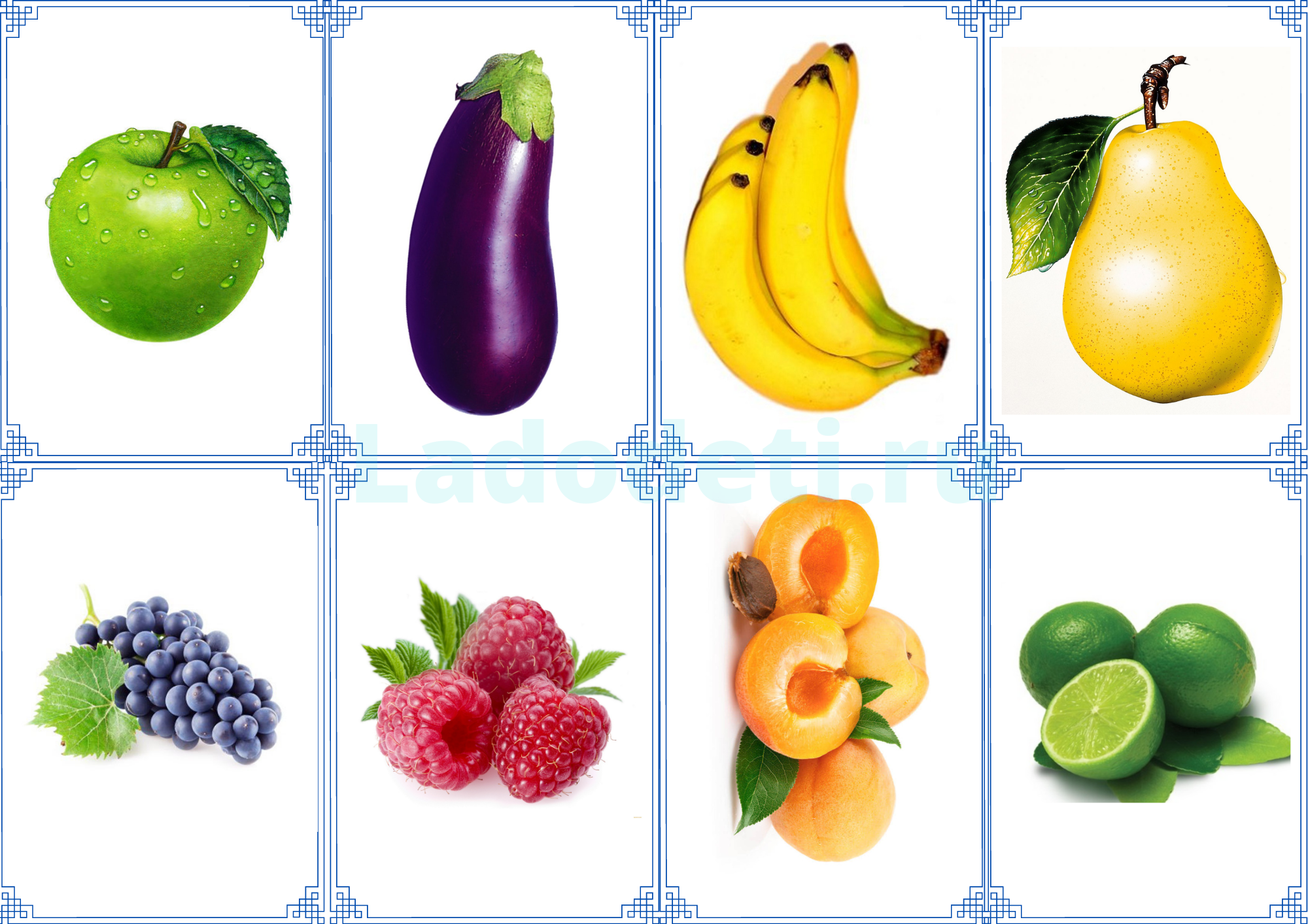 - Можно распечатать карточки с цветными фруктами и попросить ребенка, чтобы он разложил их по цвету (для этого также можно использовать карточки Домана, приведенные выше. Например, к красной карточке ребенок подбирает красные фрукты и т. д.).