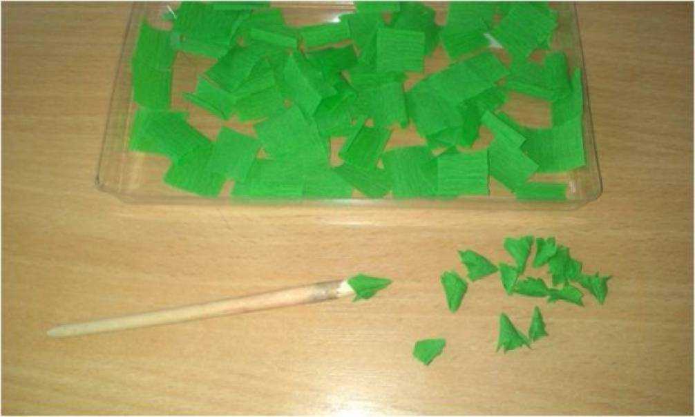 Делаем листья. Крепированную бумагу нарезать на квадраты (1,5 х 1,5 см) и с помощью палочки с заострённым концом сделать «листочки» (техника торцевания). Листья можно просто вырезать из бумаги.