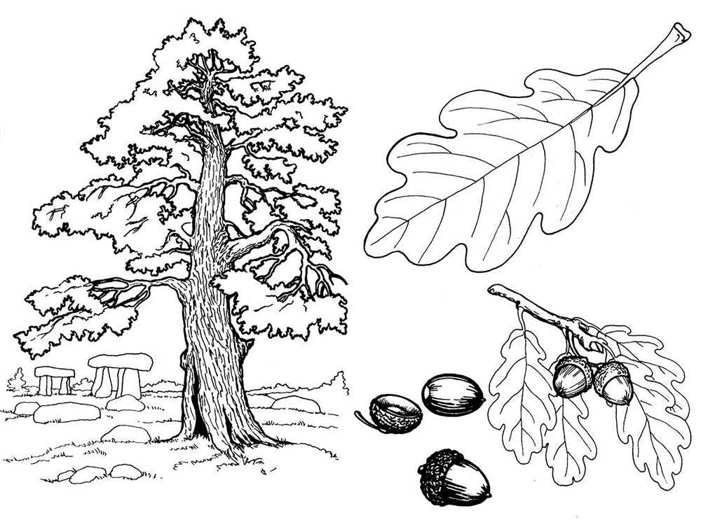 Для тех, кто любит рисовать пейзажи, раскраска деревьев и листьев послужит настоящим справочным материалом, а распечатать её можно в формате А4.