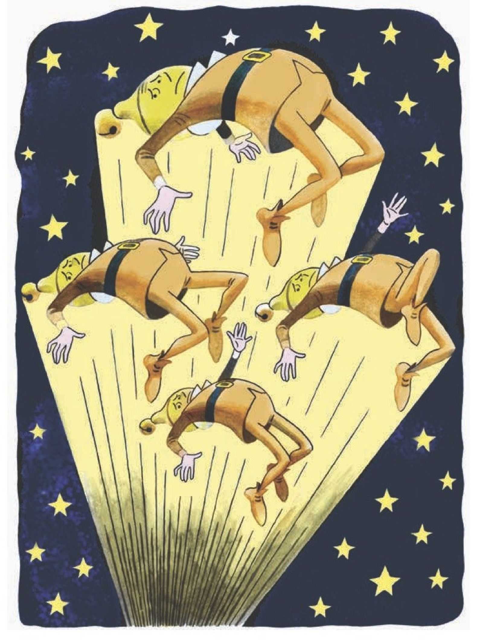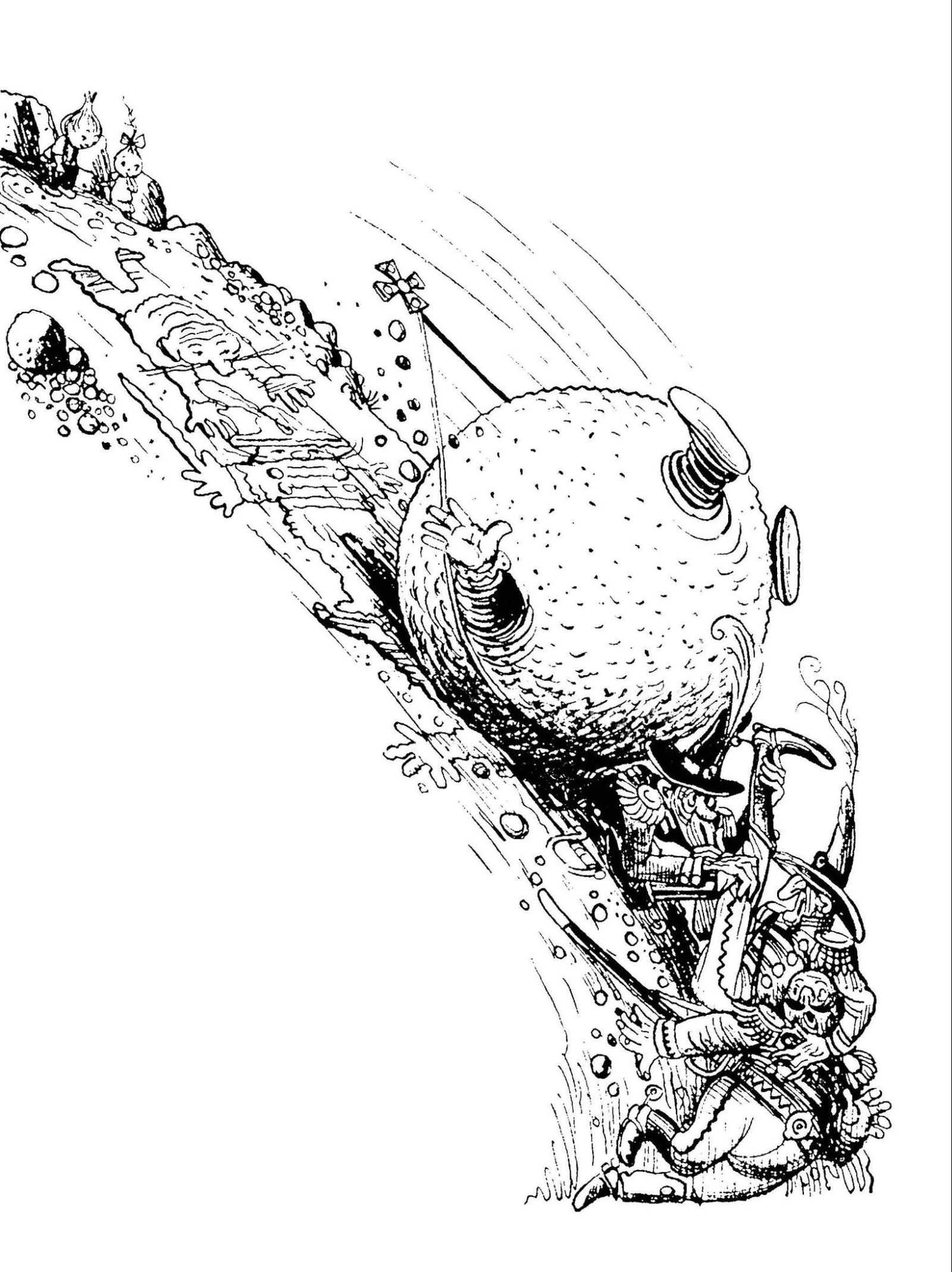 «С вершины холма навстречу генералам устремился какой-то снаряд поистине невиданных размеров. По пути он разметал кавалерию синьора Петрушки, готовившуюся к атаке, и опрокинул карету графинь Вишен. Когда же он остановился, все увидели, что это не магнитная мина и не бочка с динамитом, а попросту несчастный барон Апельсин», 1955