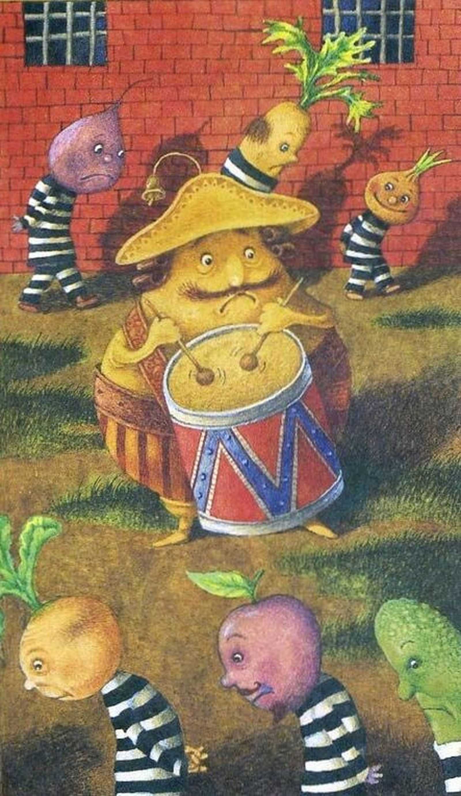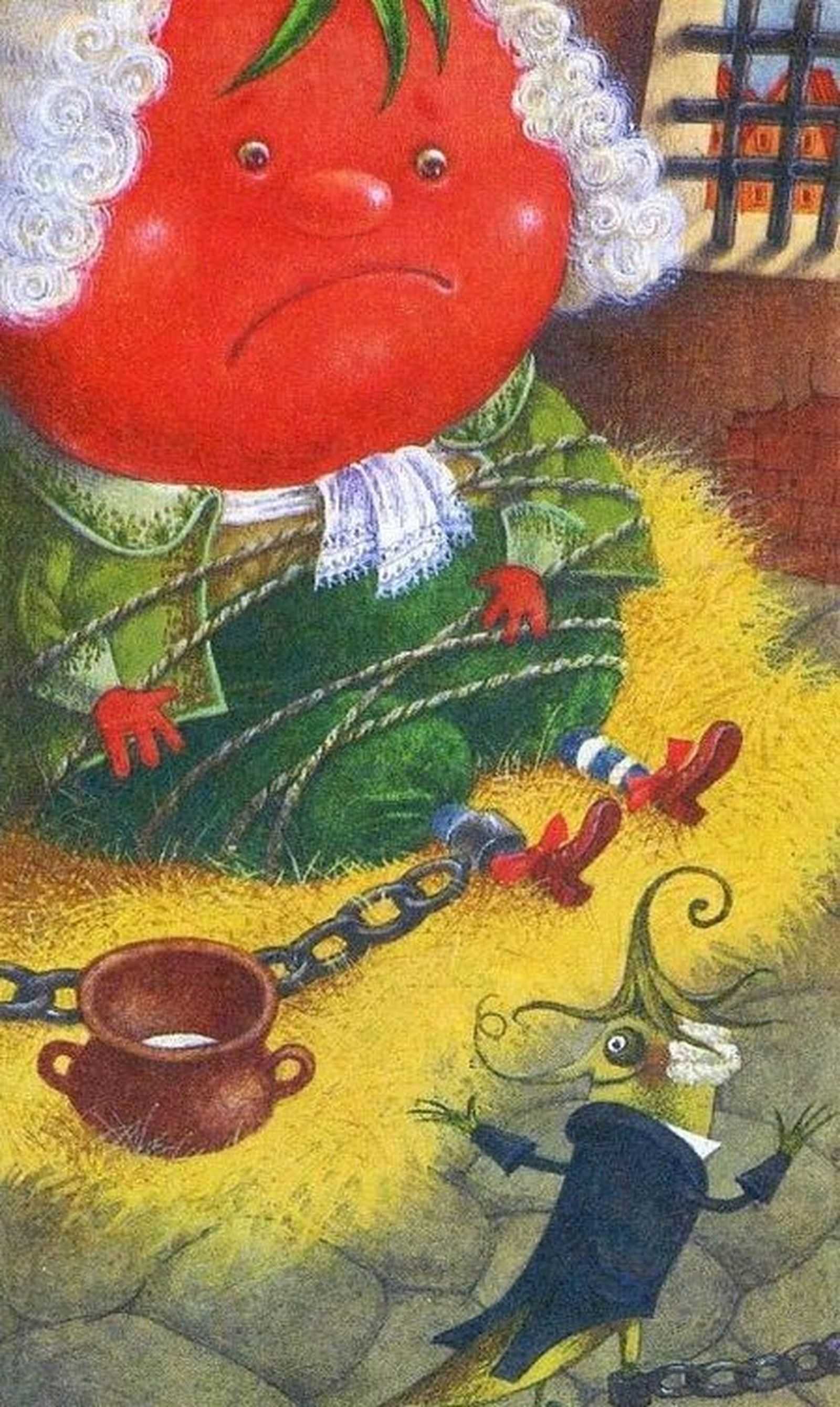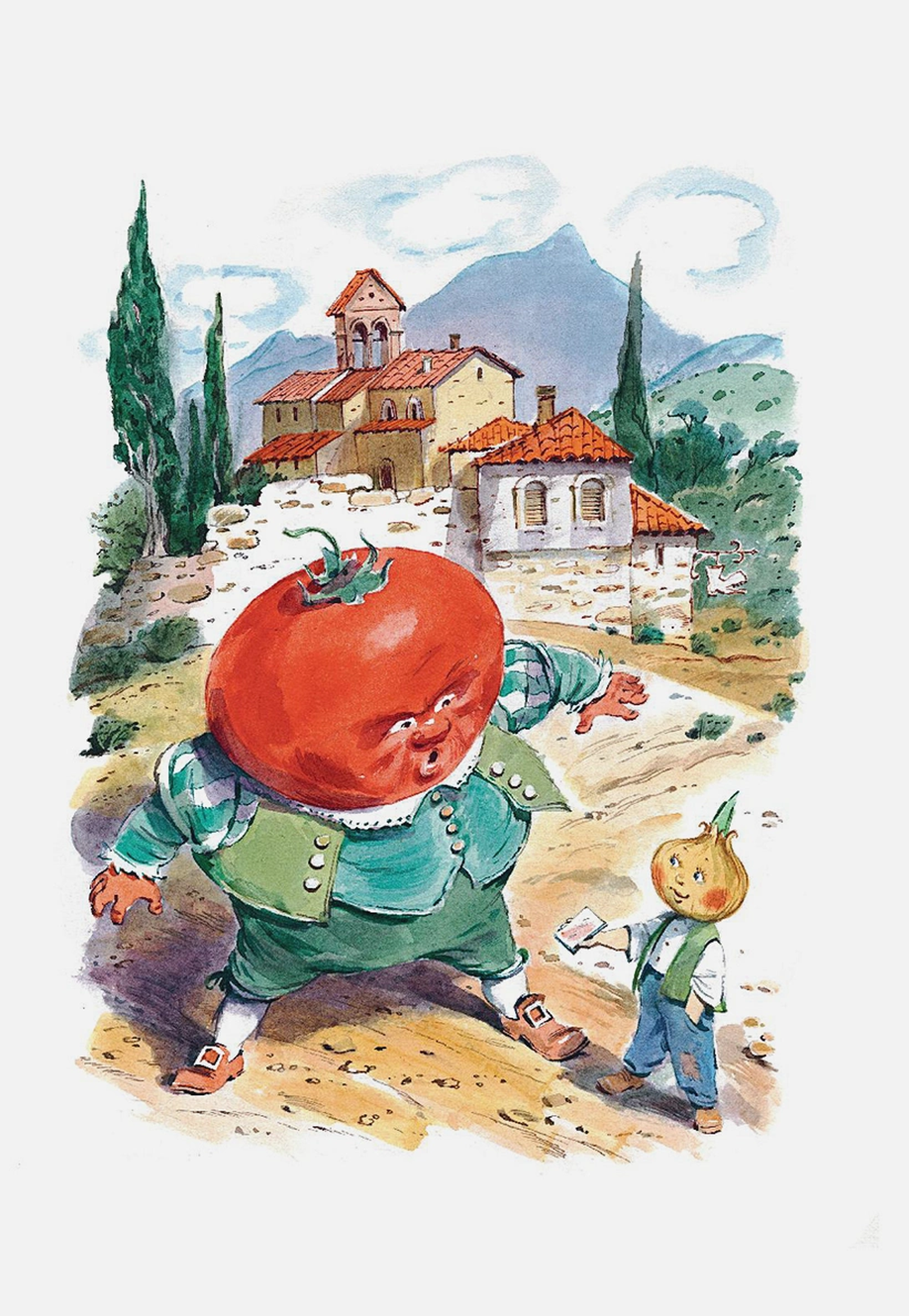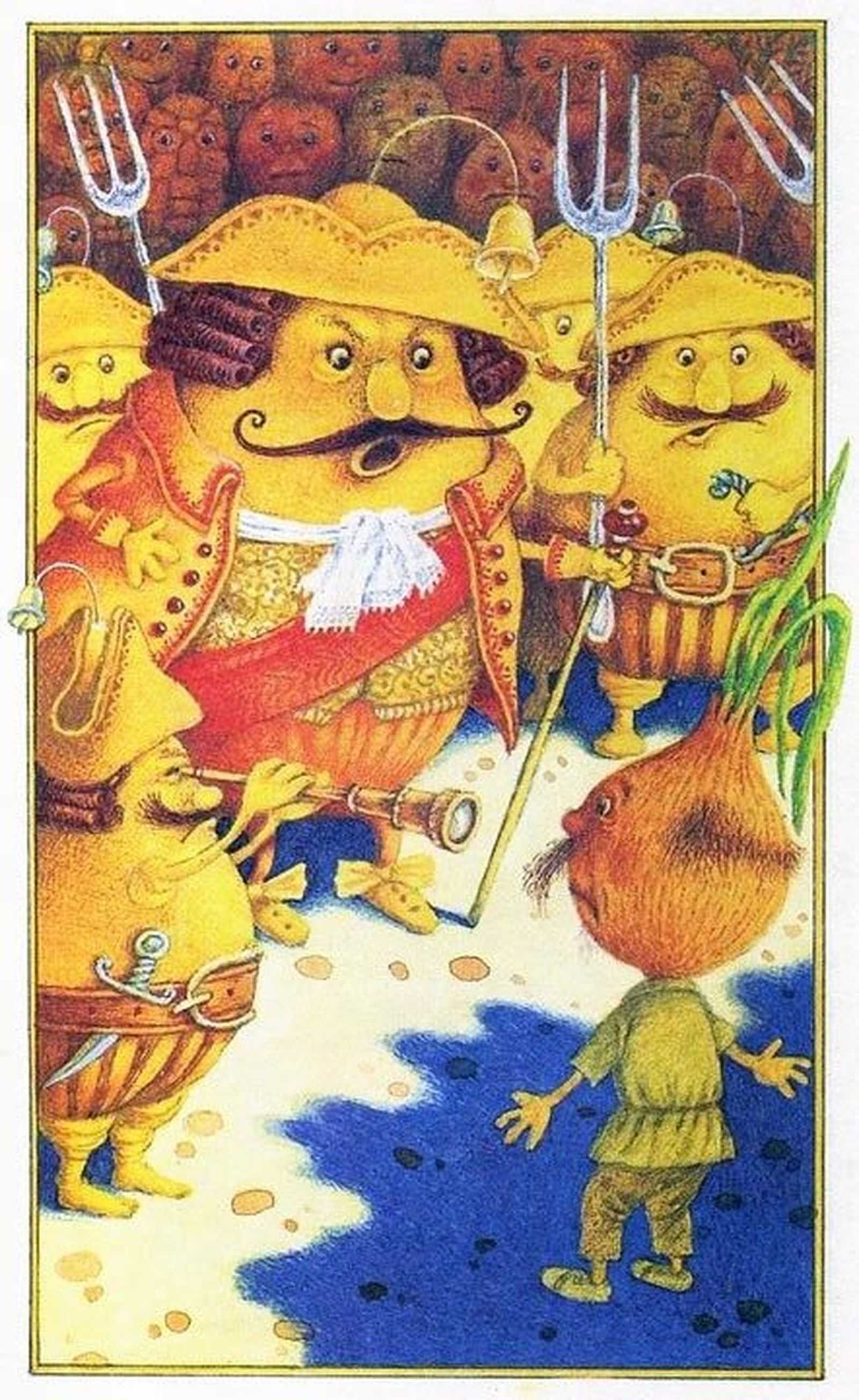 В детстве многие читали сказку о мальчике-луковке, который борется с несправедливостью богатых синьоров-фруктов. Отца Чиполлино — старого Чиполлоне — сажают в тюрьму за то, что он нечаянно наступил на мозоль принцу Лимону. Чиполлино обещает освободить отца, уходит из дома и путешествует по сказочной стране, где у власти находятся принц Лимон, графини Вишни, синьор Помидор, барон Апельсин, герцог Мандарин — символы жестокости, бессердечия и жадности. Овощи живут в нужде и обязаны платить налоги даже за воздух и дождь. Отважный герой вступает в конфликт с синьором Помидором и вместе с друзьями свергает власть тиранов. В конце сказки устанавливаются равенство и овощное братство.