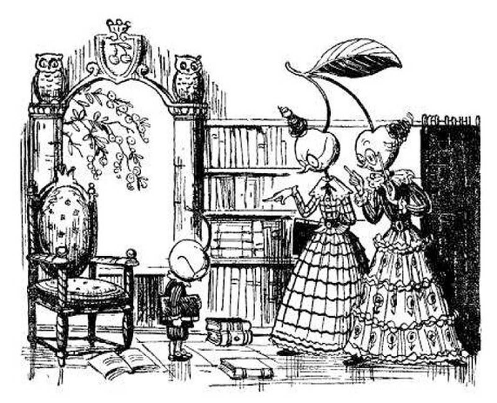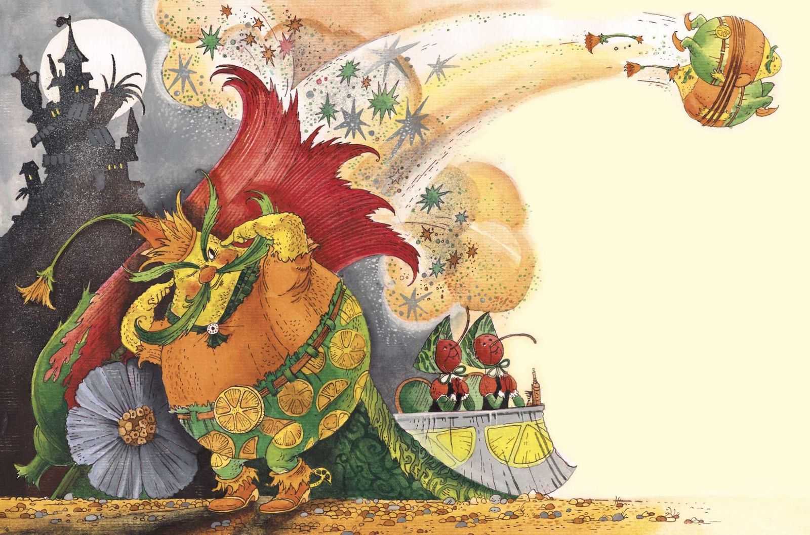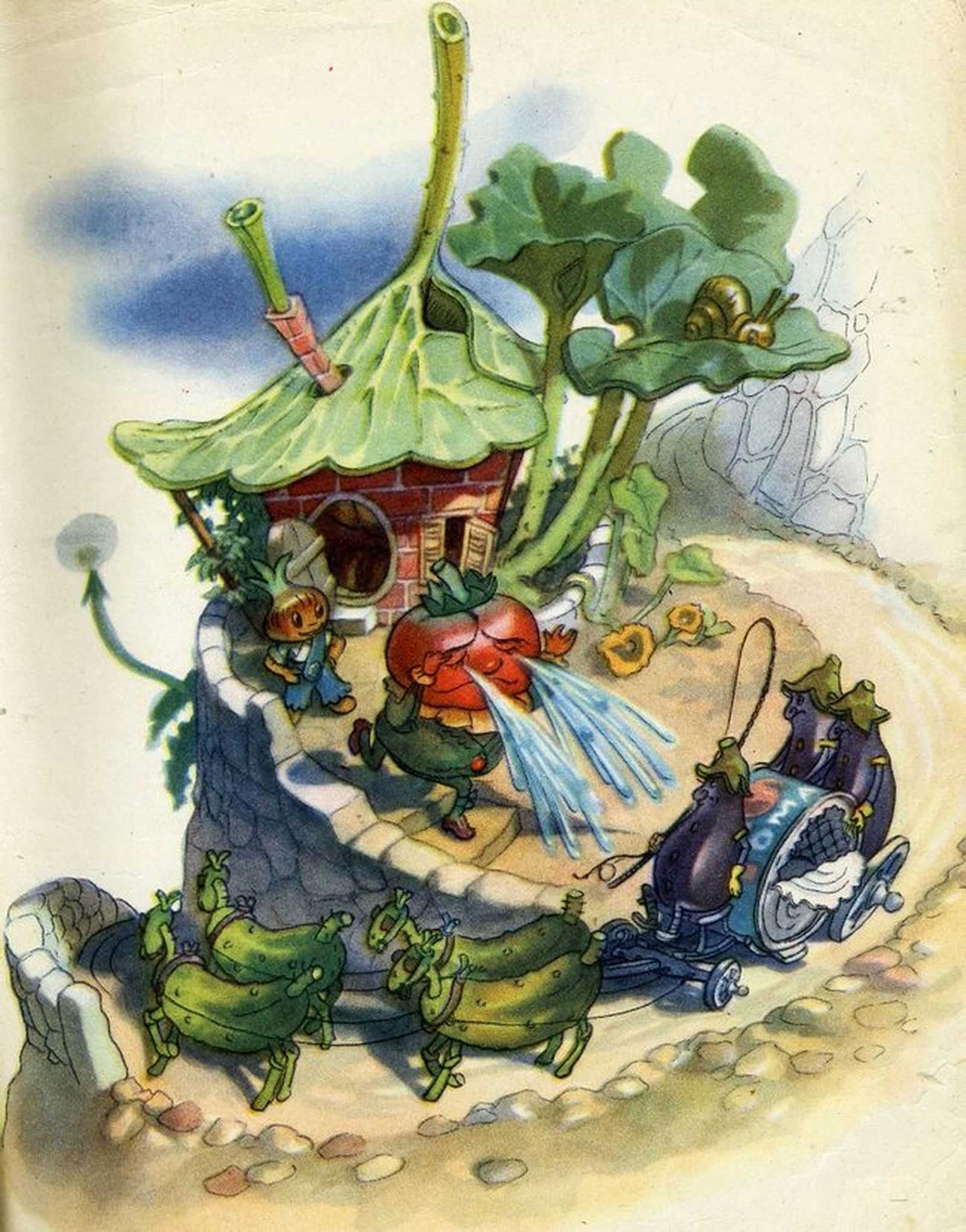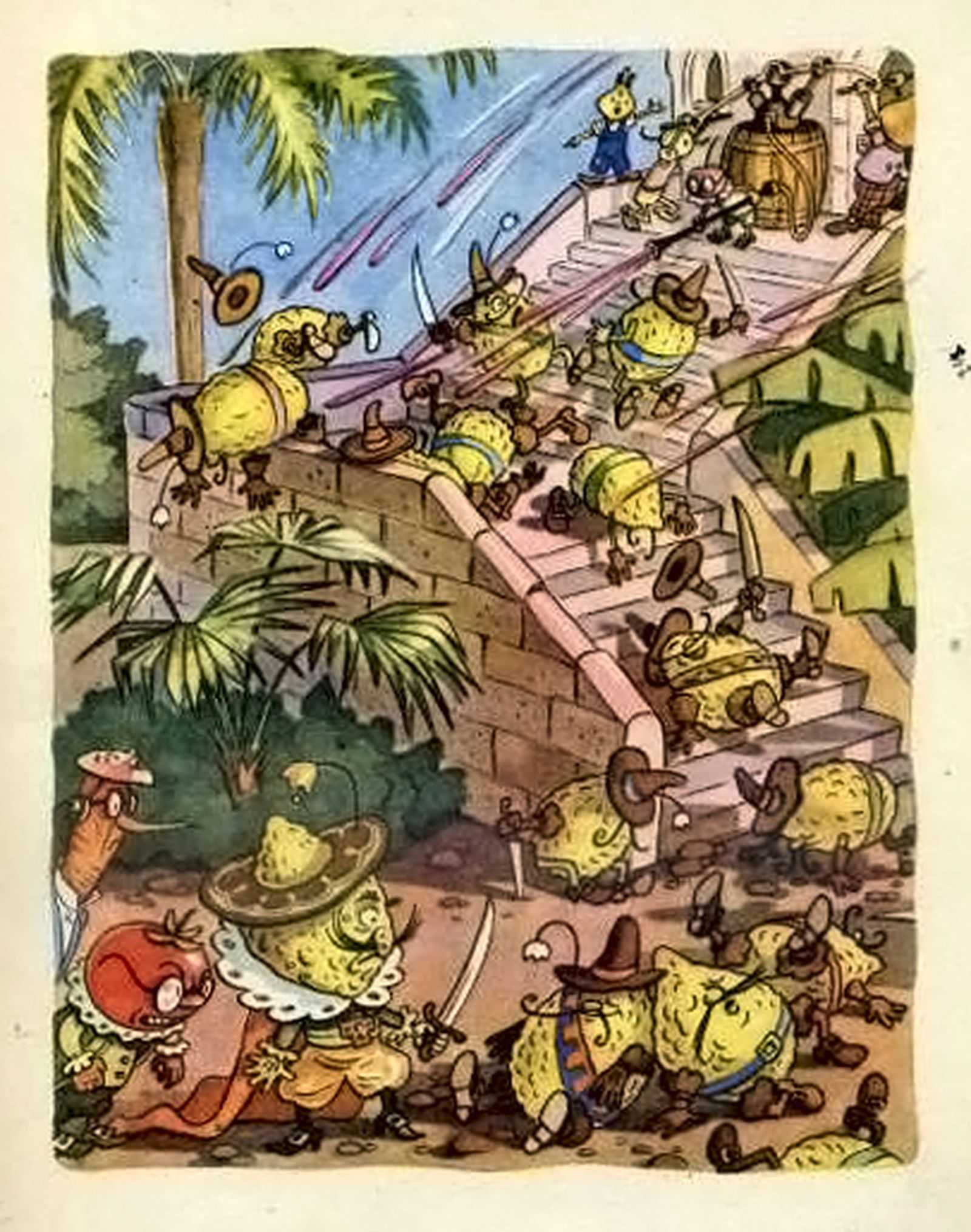«Злодей! — кричал синьор Помидор. — Разбойник! Вор! Мятежник! Бунтовщик! Ты построил этот дворец на земле, которая принадлежит графиням Вишням, и собираешься провести остаток своих дней в безделье, нарушая священные права двух бедных престарелых синьор-вдов и круглых сирот», 1955