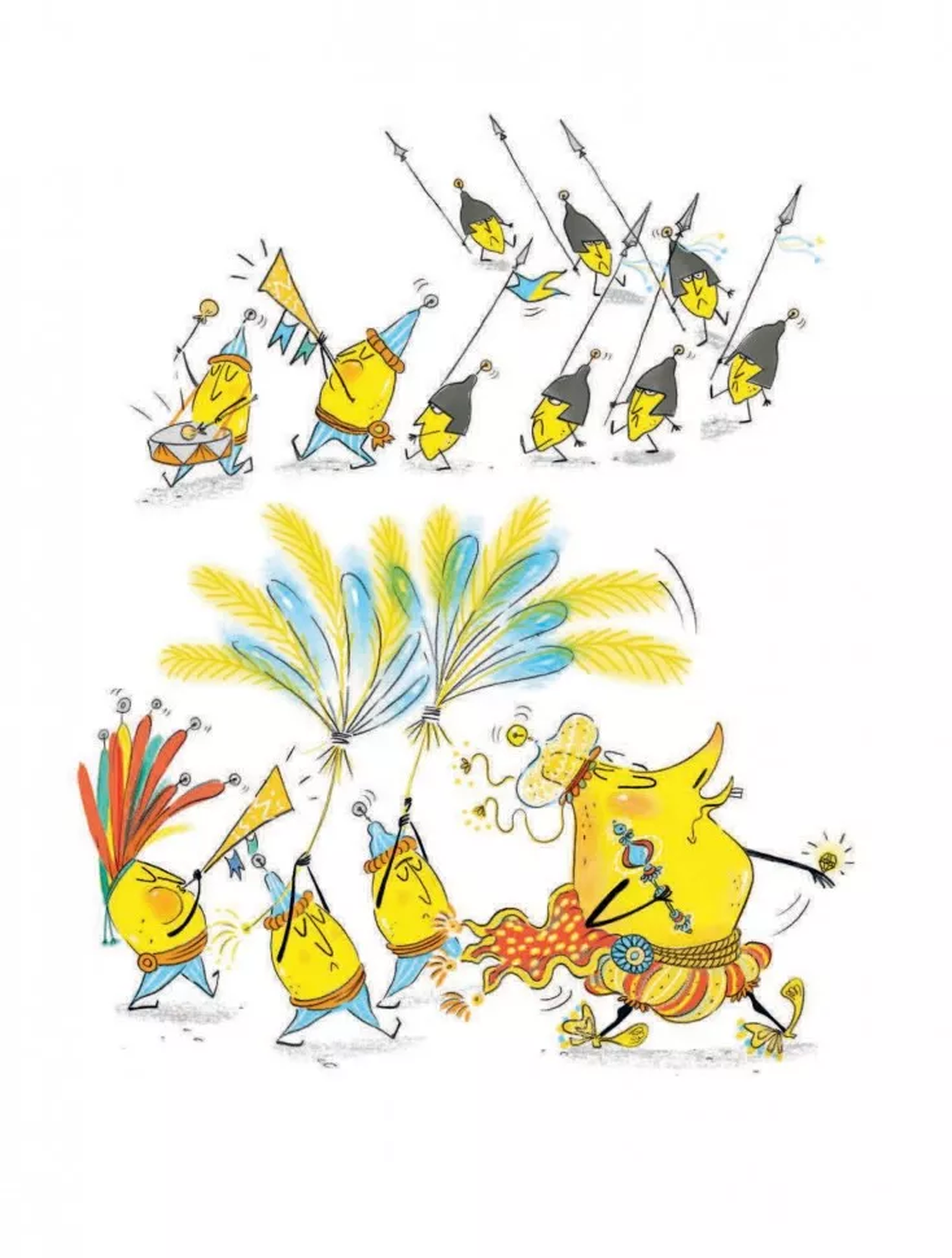«На окраину прибыл сам правитель со свитой Лимонов, Лимонишек и Лимончиков. Принц Лимон был одет во все желтое с ног до головы, а на желтой шапочке у него побрякивал золотой колокольчик. У придворных Лимонов колокольчики были серебряные, а у солдат-Лимончиков — бронзовые. Все эти колокольчики звенели, не переставая, так что получалась великолепная музыка. Послушать ее сбежалась вся улица. Народ решил, что пришел бродячий оркестр», 2018