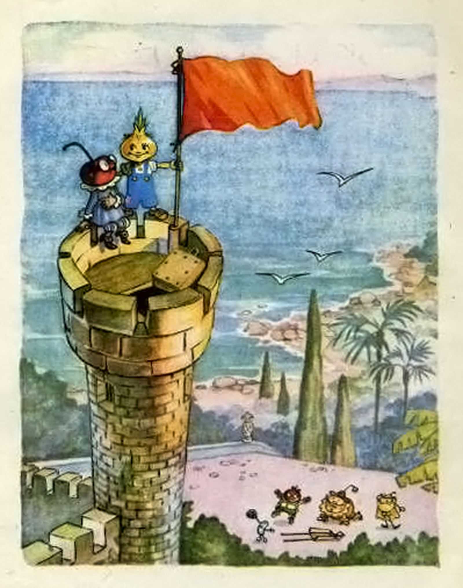 «Все так устали, что шли с закрытыми глазами, и поэтому только один из них разглядел, что на башне замка развевается знамя Свободы. Его вывесили ночью Вишенка и Чиполлино. Оба они сидели теперь наверху, на башне, и ждали, что будет дальше», 1956