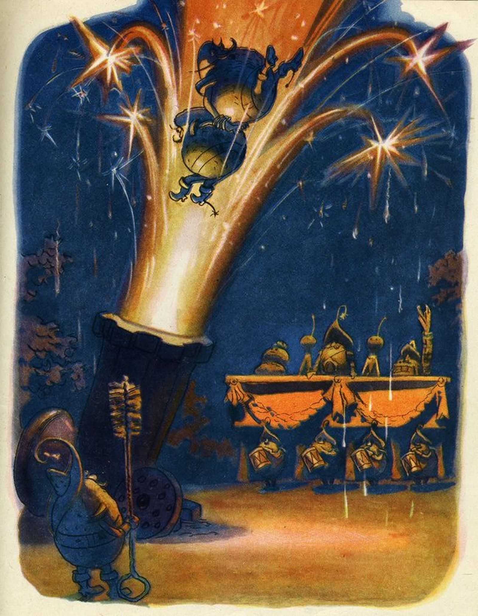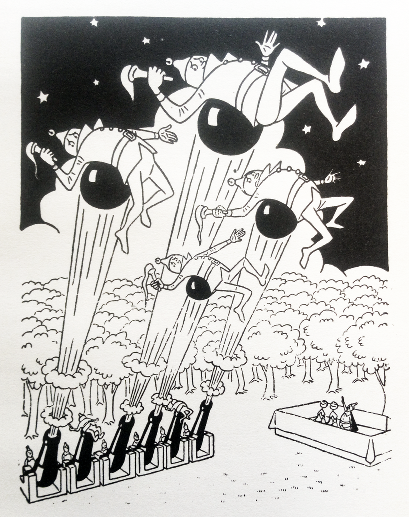«Принц Лимон устроил в лесу фейерверк, чтобы развлечь графинь. Фейерверк у него был особенный. Он связывал своих солдат-Лимончиков и стрелял ими из пушки вместо ракет. Ему казалось это очень забавным зрелищем», 1951