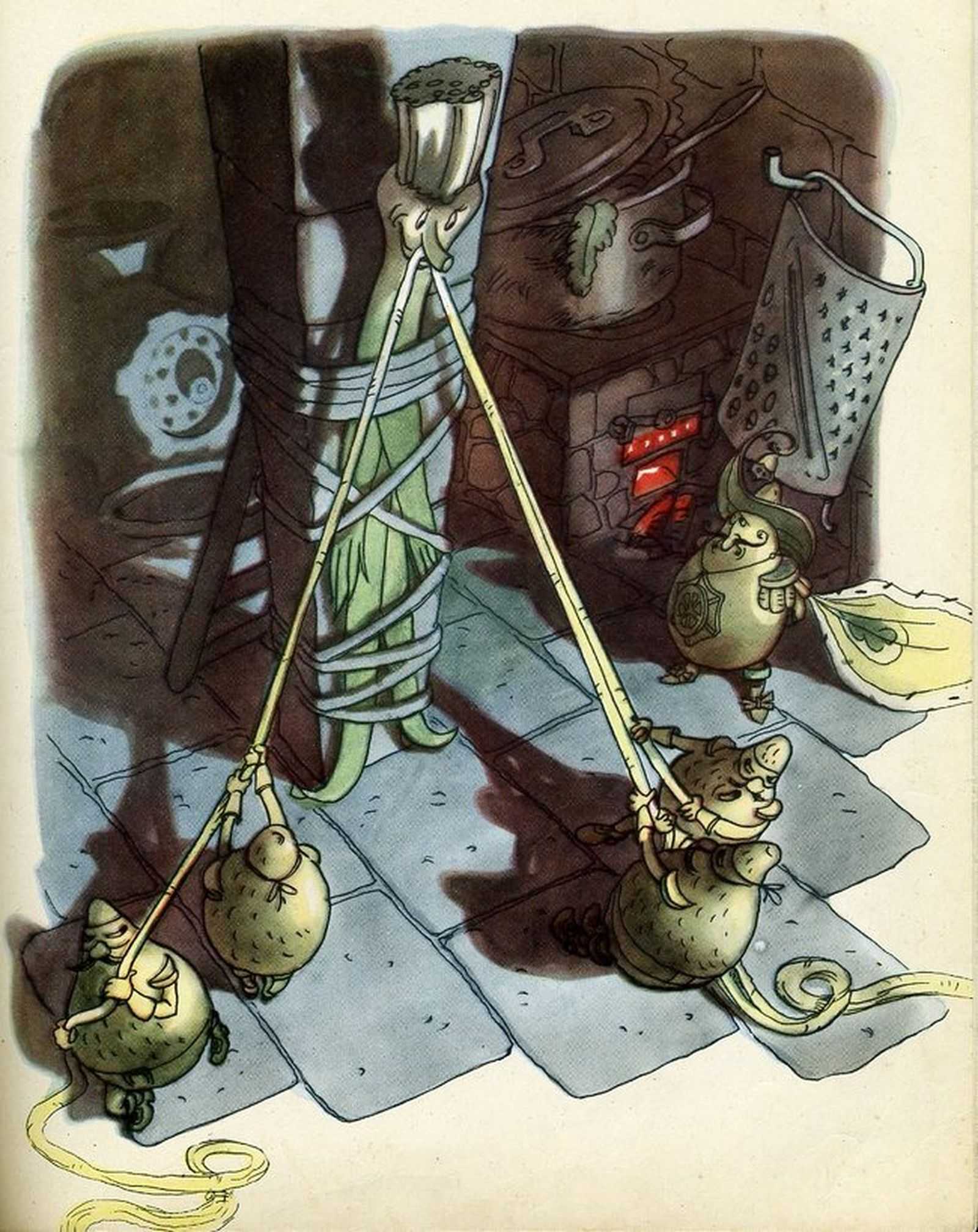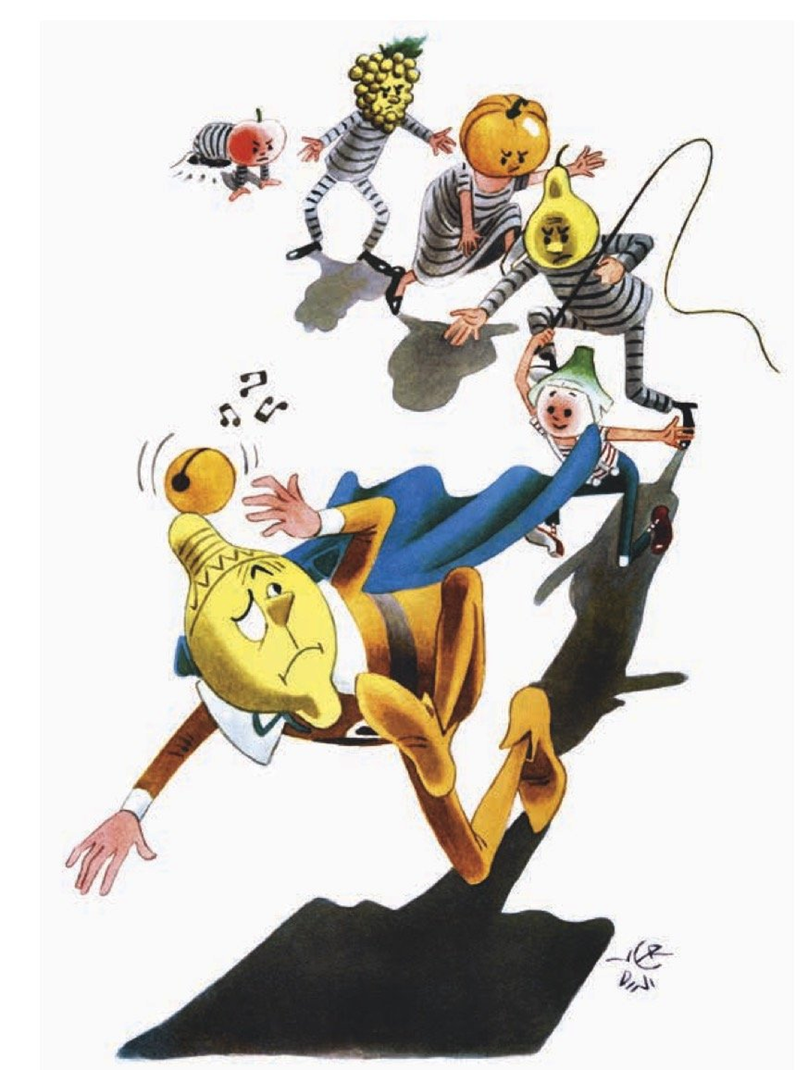 «Не забывай, дружок, — часто говорит старый Чиполлоне своему сыну Чиполлино, — негодяев на свете много, и те, кого мы выгнали, могут еще вернуться», 1955
