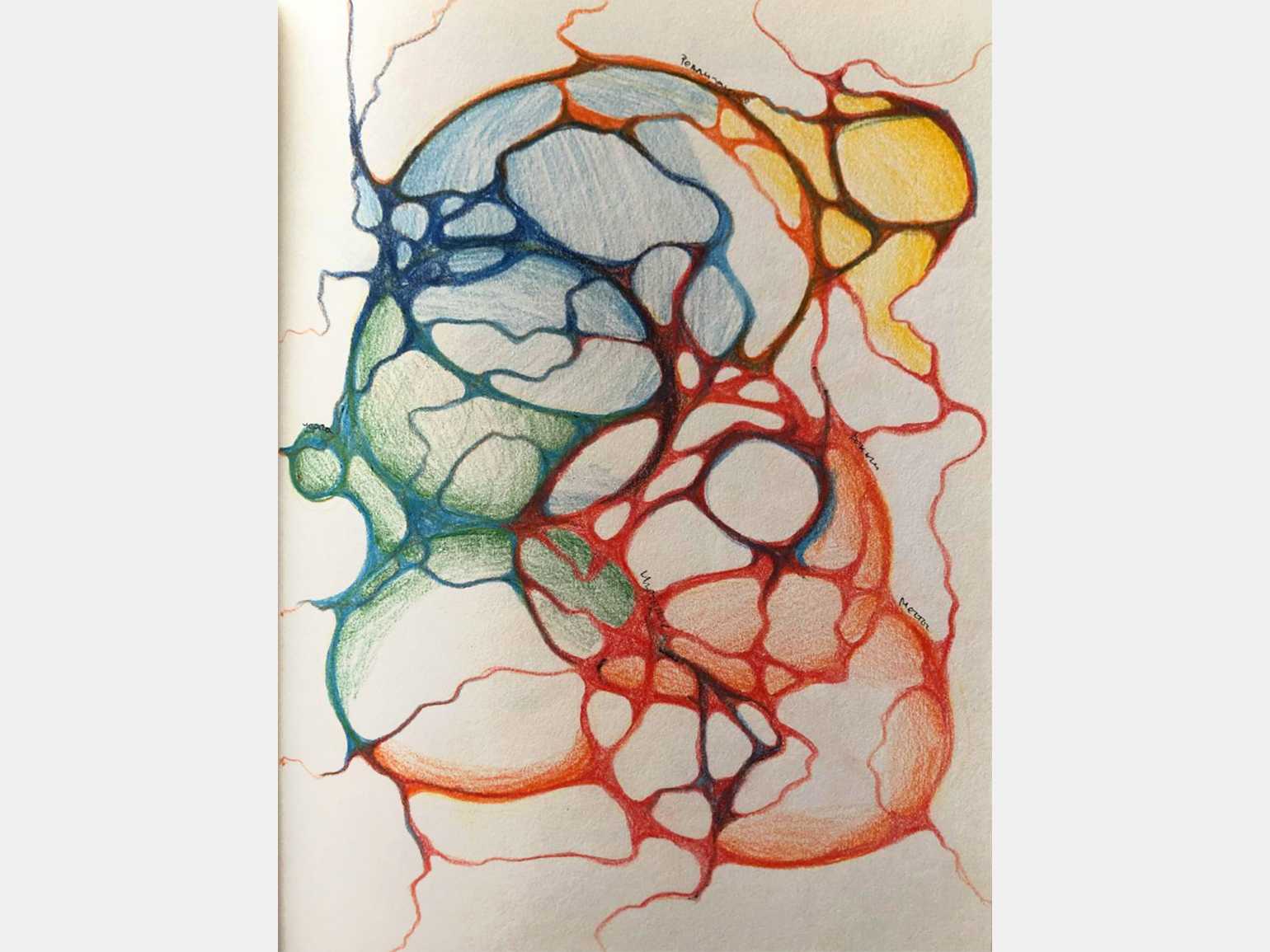 Рисуем дальше: соединяем фигуры на нашей картине нейрографическими линиями — хаотичными и беспорядочными (как чувствуем). Получается сеть — некая карта движений нейронов. На ней находим пересечения, образующие прямые или острые углы. Это — препятствия в нашем сознании, ведь природе несвойственны прямые линии и углы. Скорее скругляем их, сглаживаем и вытягиваем.