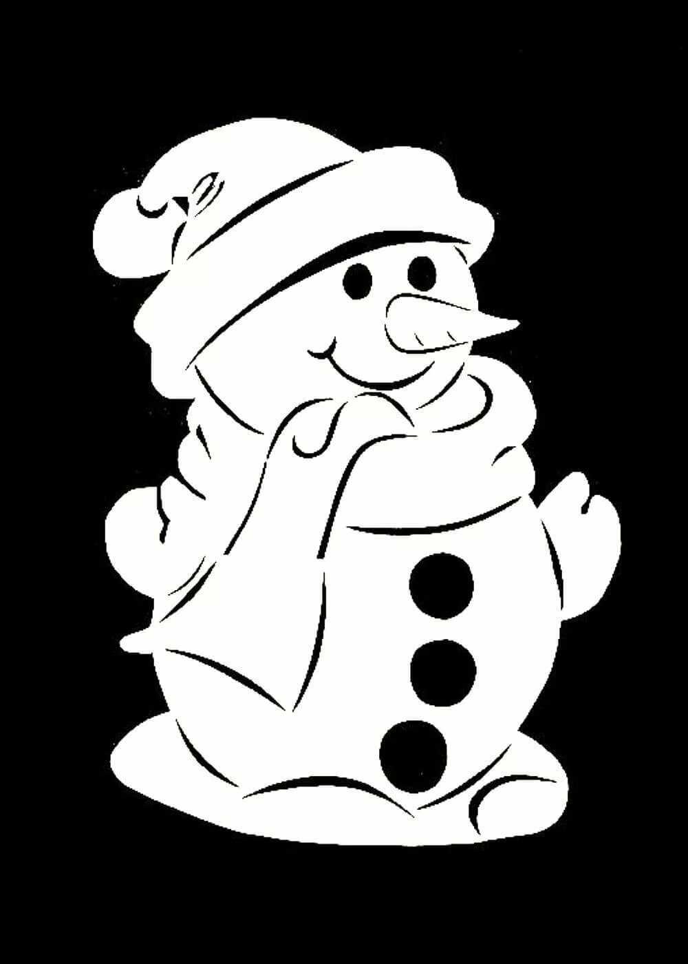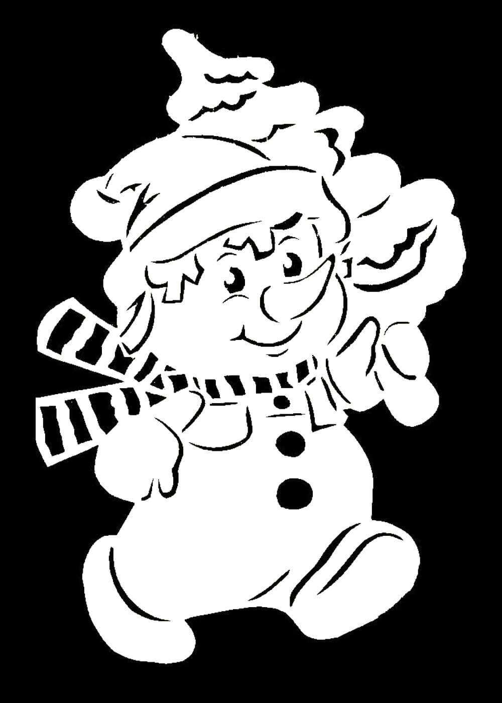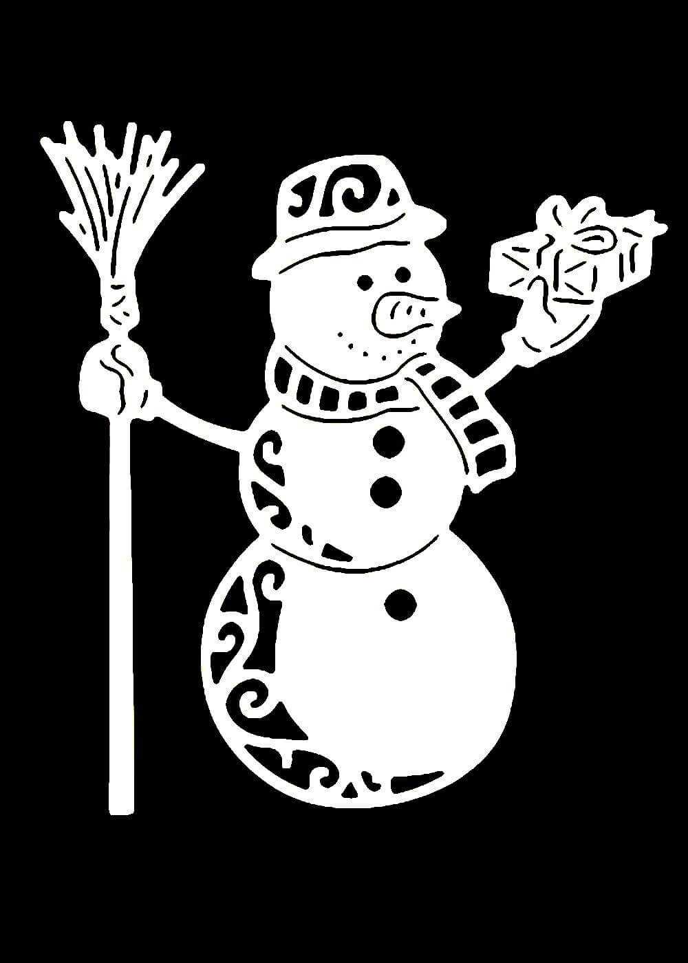 Снеговика также, как и другие элементы декора можно вырезать и изготовить в ажурном виде. В таком случае потребуется сделать вытынанку. Процесс создания ажурных фигурок более энергозатратный и наверно потребует больше внимания, нежели изготовление фигурки с помощью вырезания рисунка по контуру шаблона.