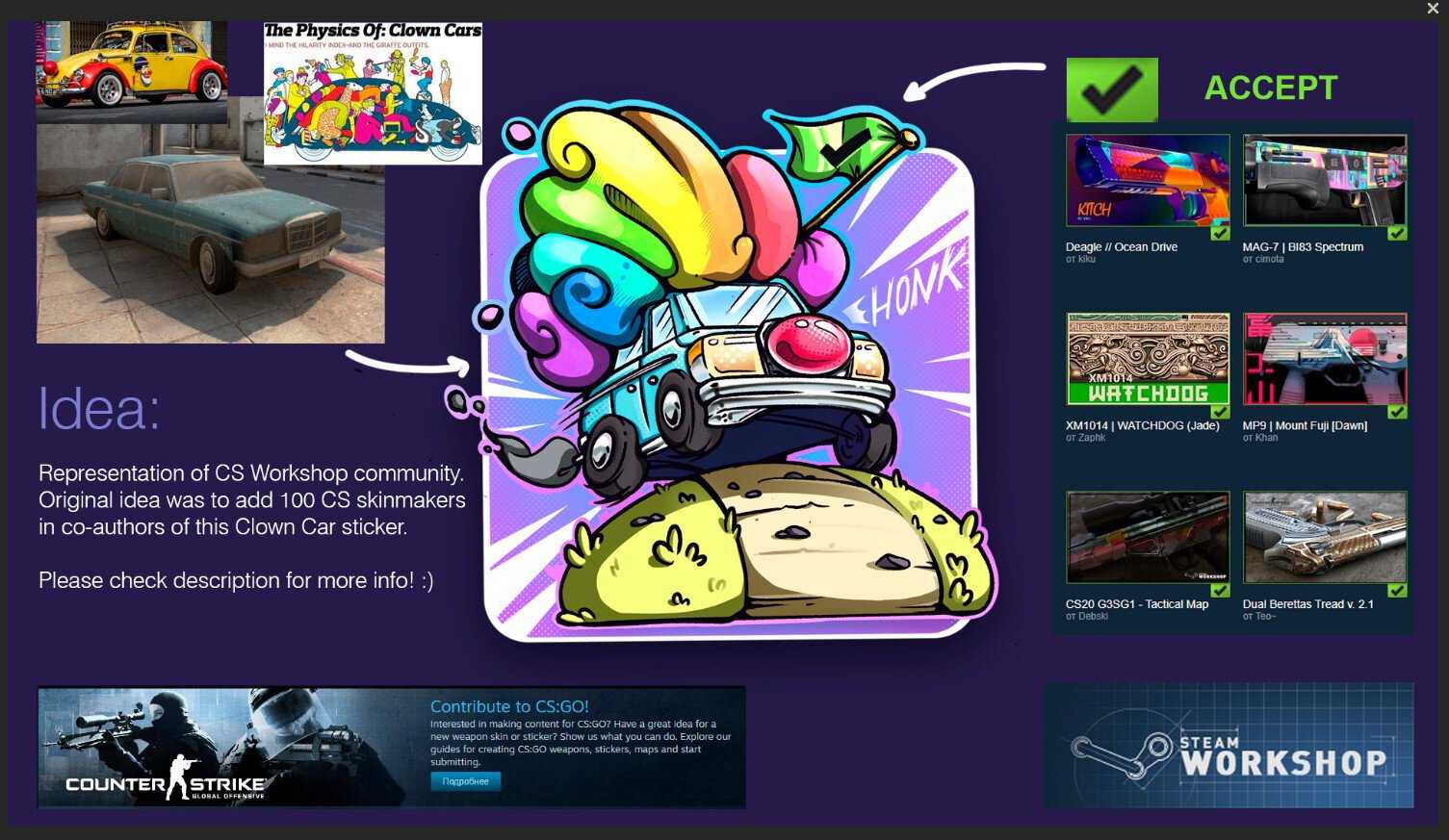 Недавно Valve завершила очередной конкурс – CS10, на котором собирает лучшие наклейки в честь десятилетия CS:GO. Океюш тоже поучаствовал в нем и подготовил более десяти наклеек. На конкурсе представили не только интересные анимированные работы, но и забавный флэшмоб. В создании одной наклейки участвовало более 85 авторов. Как говорится в описании, она посвящена всем авторам работ, которые когда-либо были в мастерской Steam.