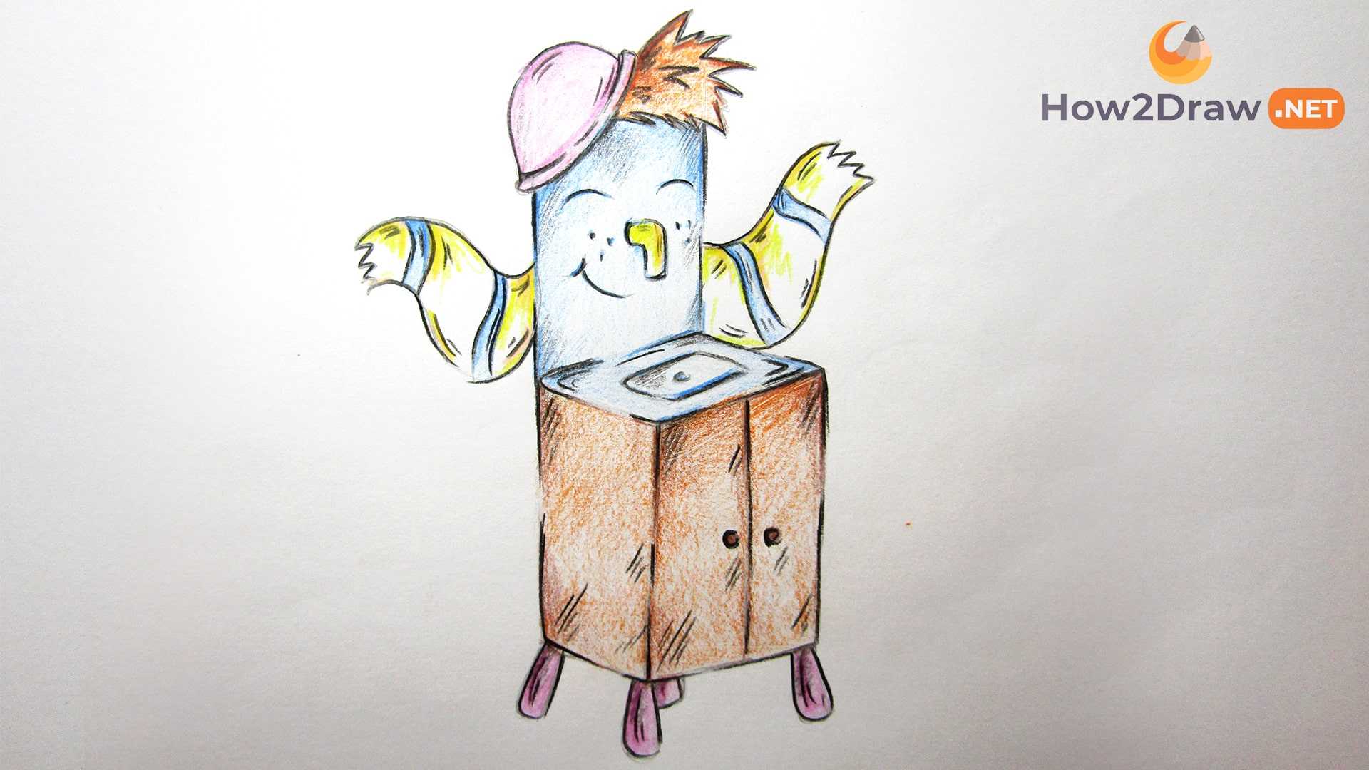 - К квадрату снизу изобразите четыре маленькие ножки, как у комода. На квадрате сплюснутым овалом нарисуйте голубой рукомойник.