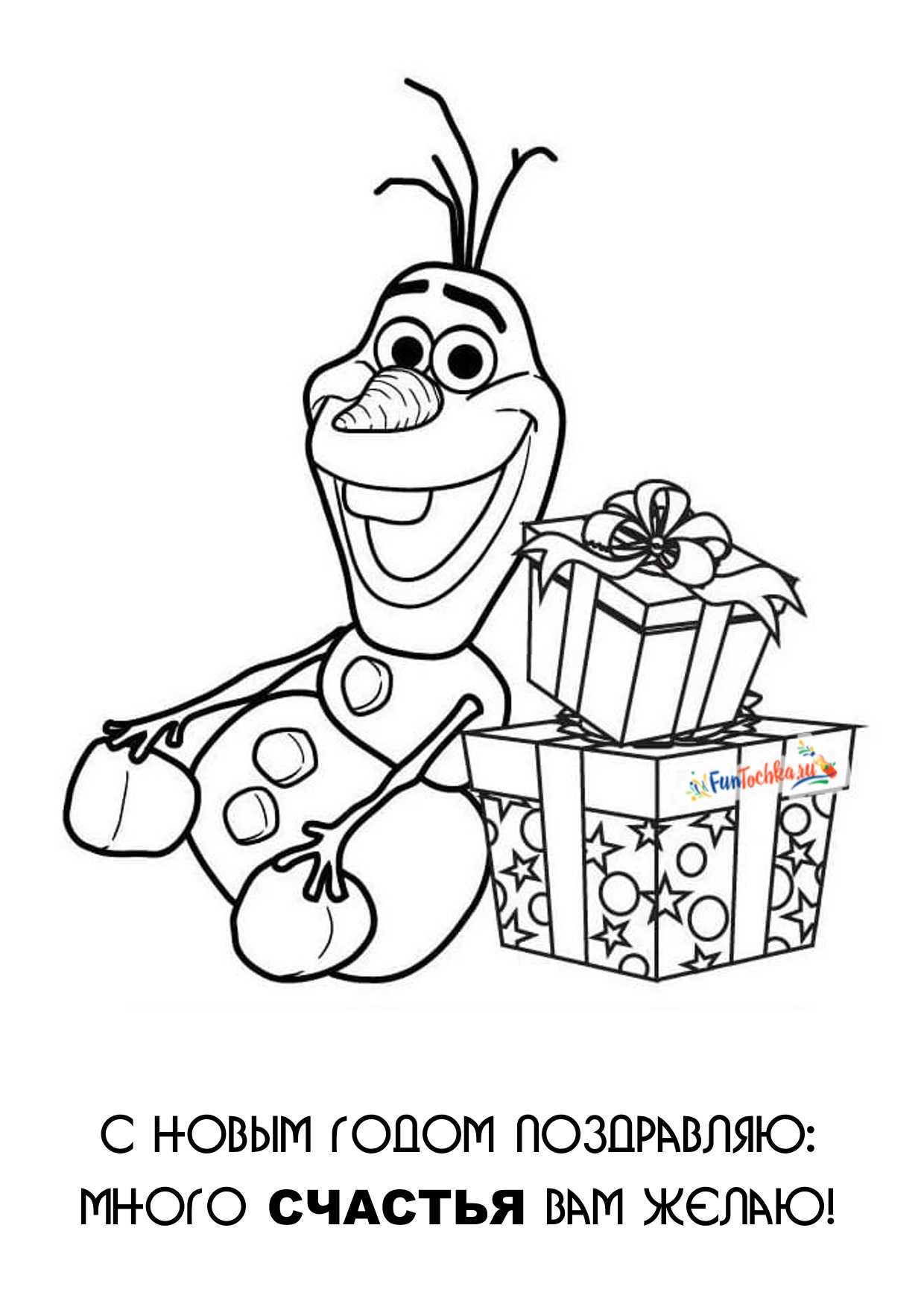 Вот снеговик Олаф в готовом поздравлении для бабушки, дедушки или папы. Скачать, распечатать, раскрасить — и радовать любимых!Прорисовка диснеевского героя динамичная, позитивная и простая, как раз для детей-дошкольников. В нём сразу чувствуется любознательный оптимизм несмотря на то, что сделан Олаф, как и все снеговики, полностью из снега.