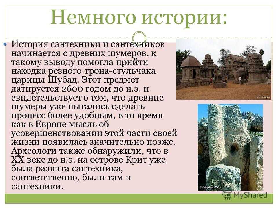Немного истории: История сантехники и сантехников начинается с древних шумеров, к такому выводу помогла прийти находка резного трона-стульчака царицы Шубад. Этот предмет датируется 2600 годом до н.э. и свидетельствует о том, что древние шумеры уже пытались сделать процесс более удобным, в то время как в Европе мысль об усовершенствовании этой части своей жизни появилась значительно позже. Археологи также обнаружили, что в XX веке до н.э. на острове Крит уже была развита сантехника, соответственно, были там и сантехники.