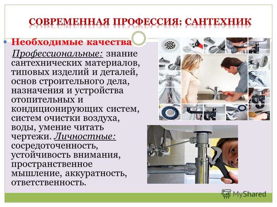 Необходимые качества Профессиональные: знание сантехнических материалов, типовых изделий и деталей, основ строительного дела, назначения и устройства отопительных и кондиционирующих систем, систем очистки воздуха, воды, умение читать чертежи. Личностные: сосредоточенность, устойчивость внимания, пространственное мышление, аккуратность, ответственность.