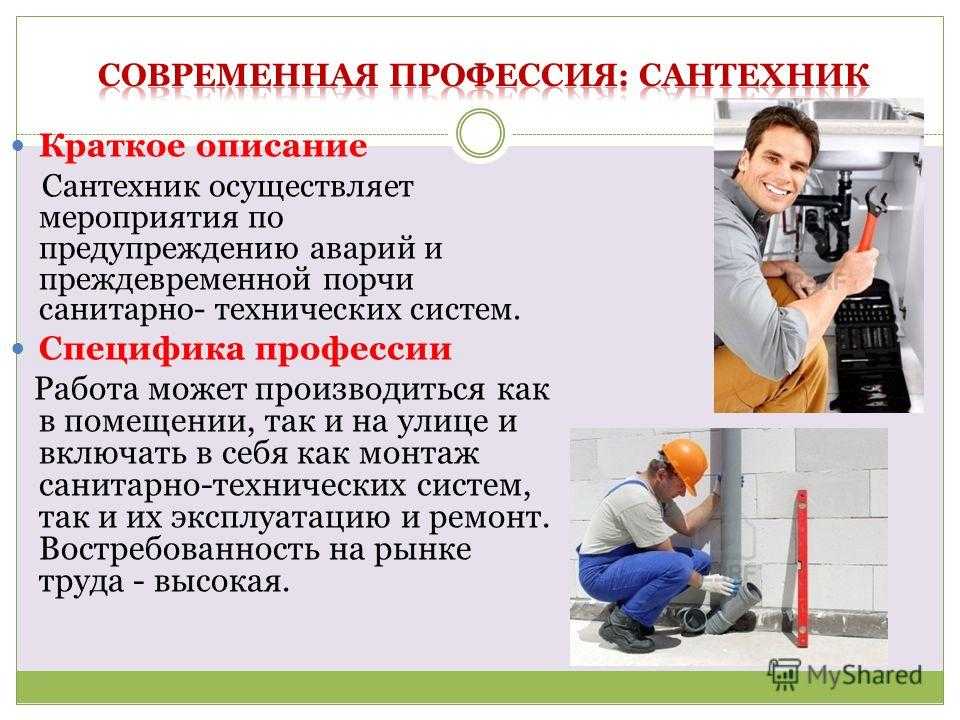 Краткое описание Сантехник осуществляет мероприятия по предупреждению аварий и преждевременной порчи санитарно- технических систем. Специфика профессии Работа может производиться как в помещении, так и на улице и включать в себя как монтаж санитарно-технических систем, так и их эксплуатацию и ремонт. Востребованность на рынке труда — высокая.
