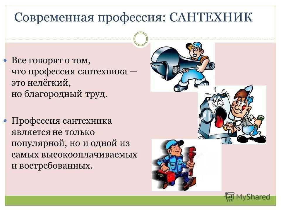 Современная профессия: САНТЕХНИК Все говорят о том, что профессия сантехника это нелёгкий, но благородный труд. Профессия сантехника является не только популярной, но и одной из самых высокооплачиваемых и востребованных.