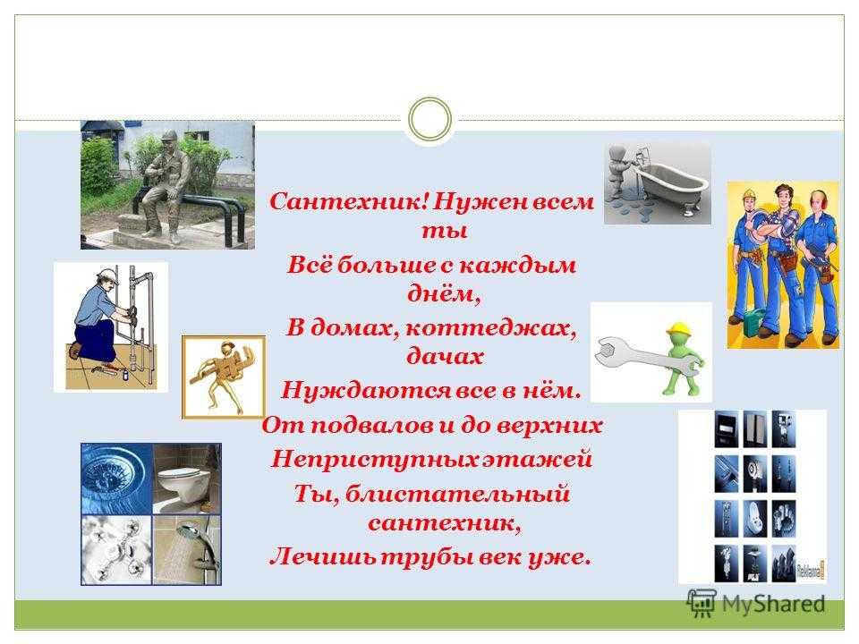 Сантехник! Нужен всем ты Всё больше с каждым днём, В домах, коттеджах, дачах Нуждаются все в нём. От подвалов и до верхних Неприступных этажей Ты, блистательный сантехник, Лечишь трубы век уже.
