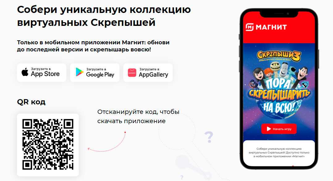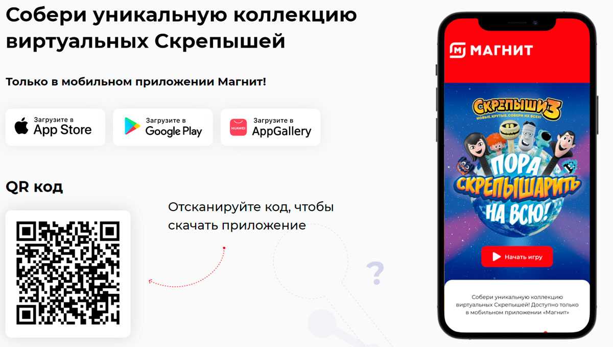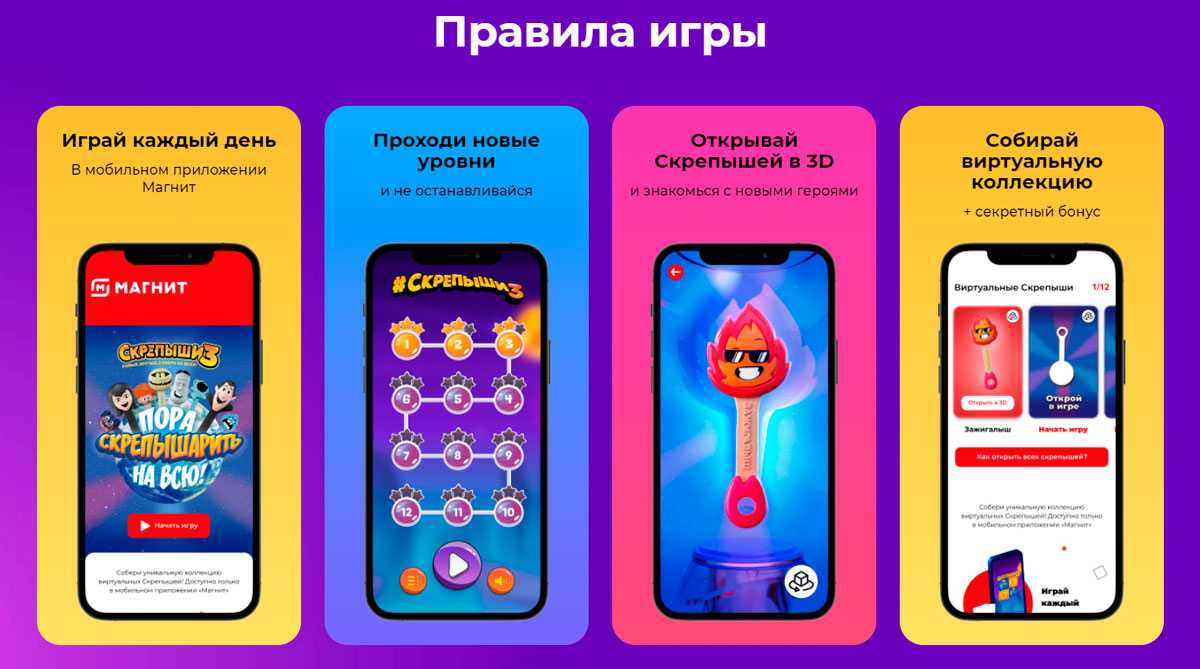 С 15 сентября по 26 октября 2021 г. в мобильном ПО Магнит запускается игра Мемо Скрепыши 3. Суть состоит в запоминании изображений. Чтобы пройти игру, Вам необходимо преодолеть 12 уровней. Еженедельно открывается по 3 новых игровых уровней. После каждого пройденного уровня становится активной одна виртуальная игрушка скрепыш. После преодоления всех уровней победителю предоставляется скидочный купон!