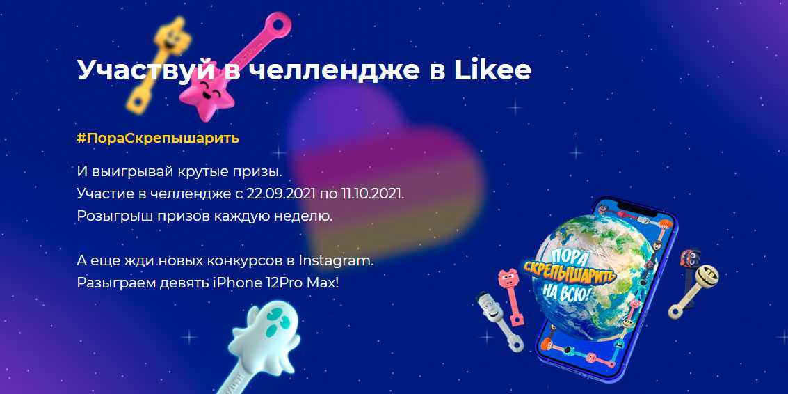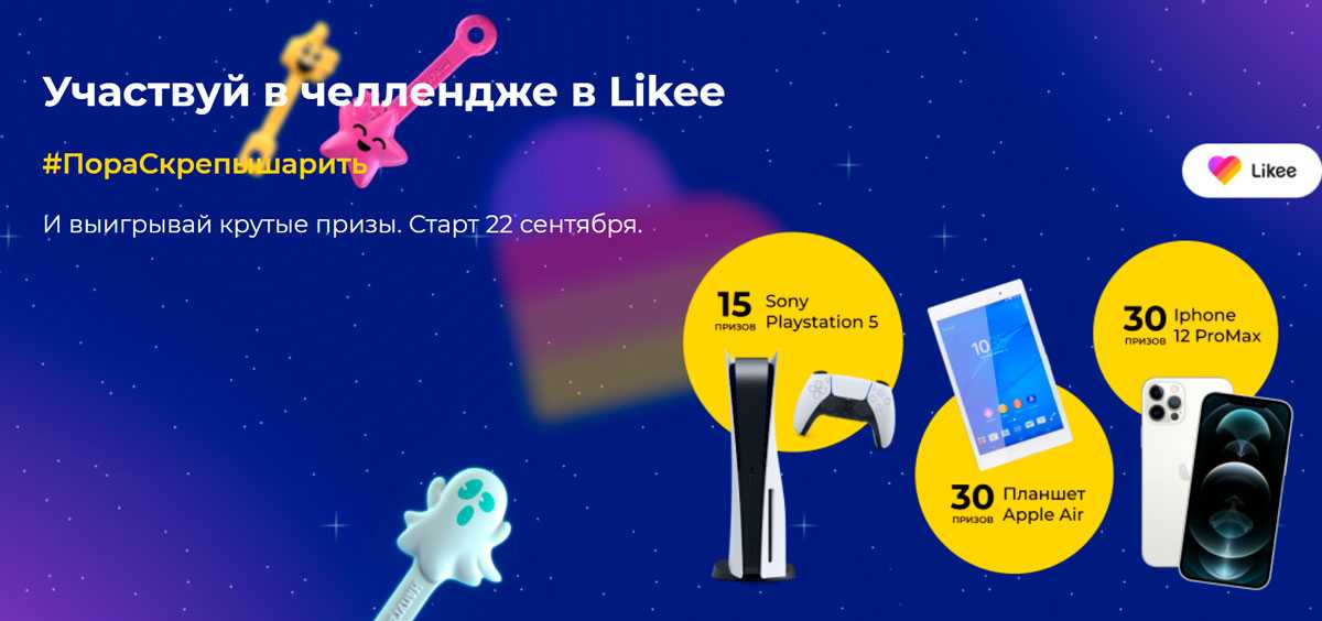 - Снять с 22 сентября по 11 октября 2021 года видеролик согласно условиям на хэштег-странице Likee #ПораСкрепышарпить. Съемку ролика следует выполнять под конкурсный музыкальный трек при использовании Маски Конкурса.