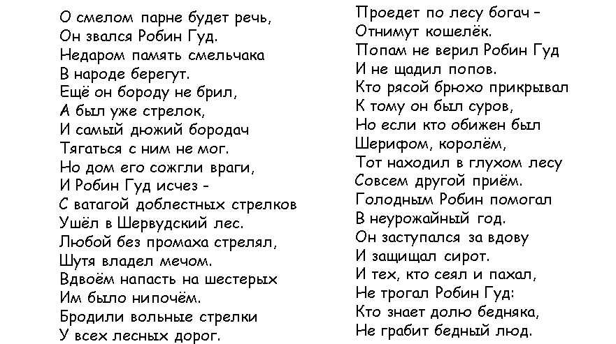 В первых вариантах баллада существовала в форме народной песни, под которую было принято танцевать. Открывает цикл баллада о том, что наш герой великолепно стрелял из лука.