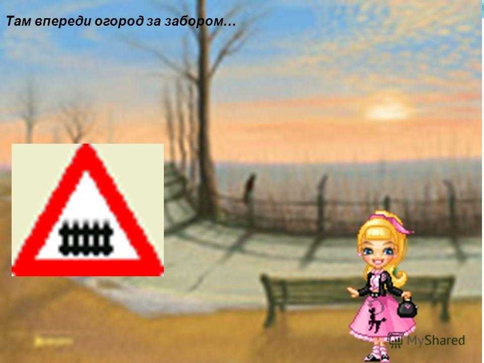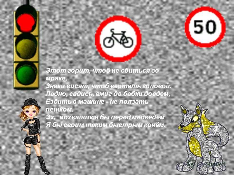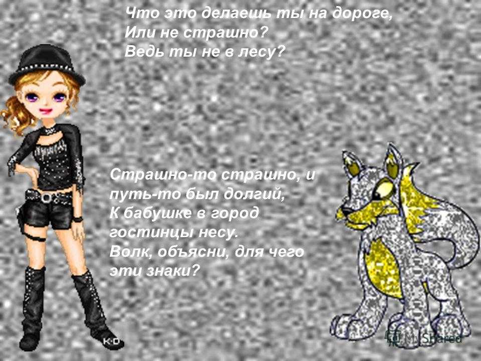 Что это делаешь ты на дороге, Или не страшно? Ведь ты не в лесу? Страшно-то страшно, и путь-то был долгий, К бабушке в город гостинцы несу. Волк, объясни, для чего эти знаки?