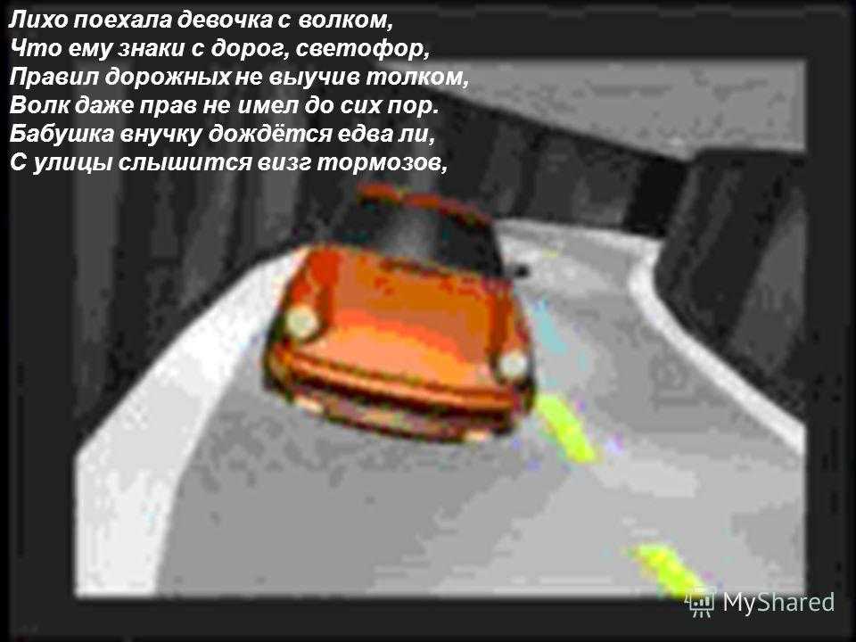 Лихо поехала девочка с волком, Что ему знаки с дорог, светофор, Правил дорожных не выучив толком, Волк даже прав не имел до сих пор. Бабушка внучку дождётся едва ли, С улицы слышится визг тормозов,