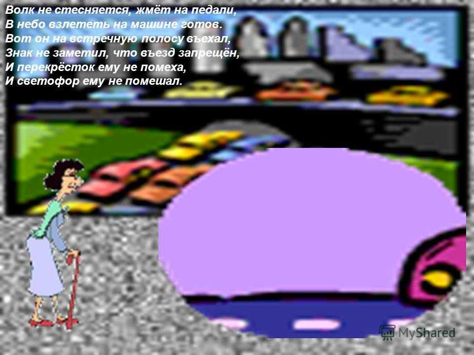 Волк не стесняется, жмёт на педали, В небо взлететь на машине готов. Вот он на встречную полосу въехал, Знак не заметил, что въезд запрещён, И перекрёсток ему не помеха, И светофор ему не помешал.