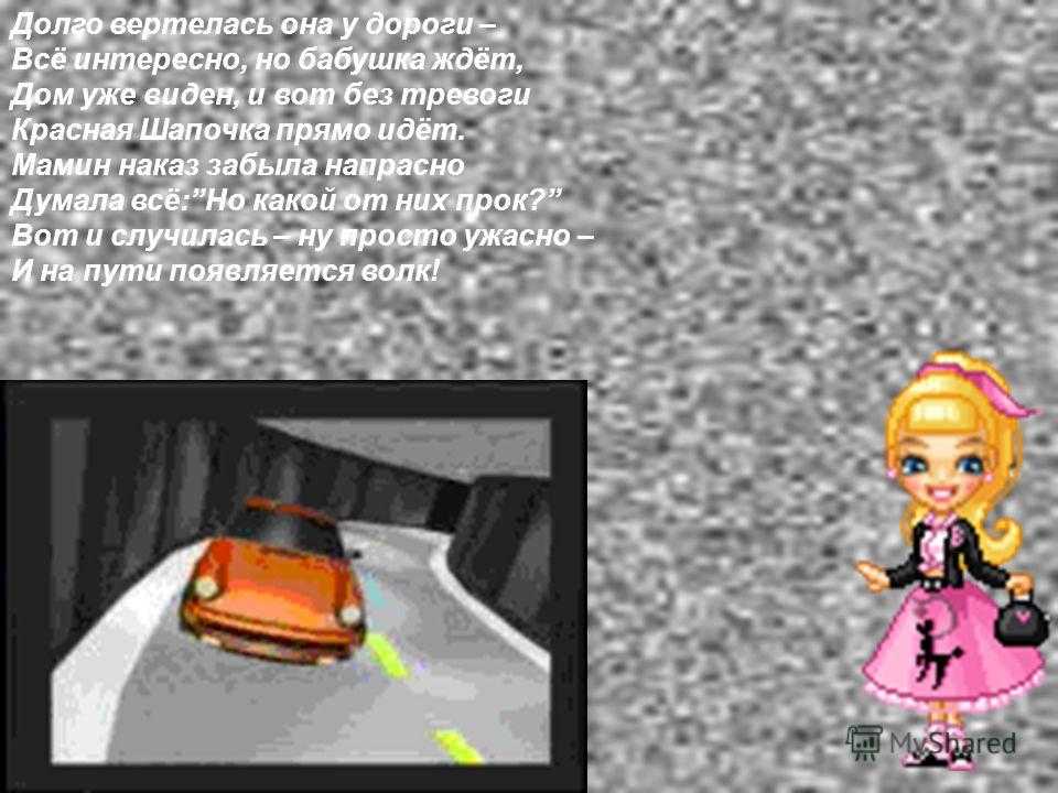 Долго вертелась она у дороги – Всё интересно, но бабушка ждёт, Дом уже виден, и вот без тревоги Красная Шапочка прямо идёт. Мамин наказ забыла напрасно Думала всё:Но какой от них прок? Вот и случилась – ну просто ужасно – И на пути появляется волк!