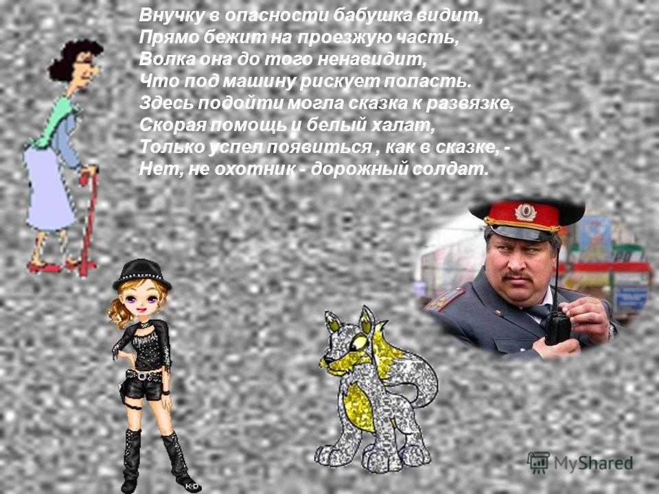 Внучку в опасности бабушка видит, Прямо бежит на проезжую часть, Волка она до того ненавидит, Что под машину рискует попасть. Здесь подойти могла сказка к развязке, Скорая помощь и белый халат, Только успел появиться, как в сказке, — Нет, не охотник — дорожный солдат.