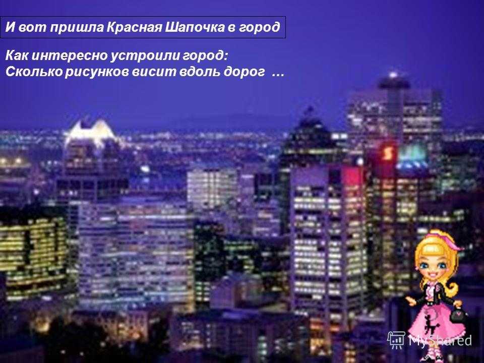 И вот пришла Красная Шапочка в город Как интересно устроили город: Сколько рисунков висит вдоль дорог …