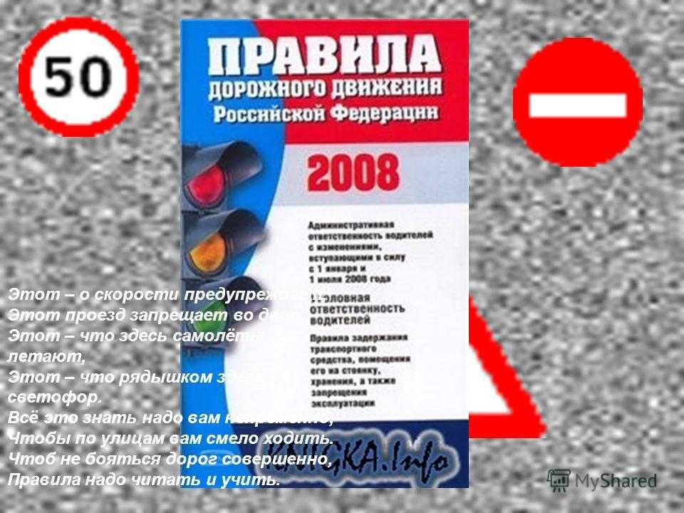 Этот – о скорости предупреждает, Этот проезд запрещает во двор, Этот – что здесь самолёты летают, Этот – что рядышком здесь светофор. Всё это знать надо вам непременно, Чтобы по улицам вам смело ходить. Чтоб не бояться дорог совершенно, Правила надо читать и учить.