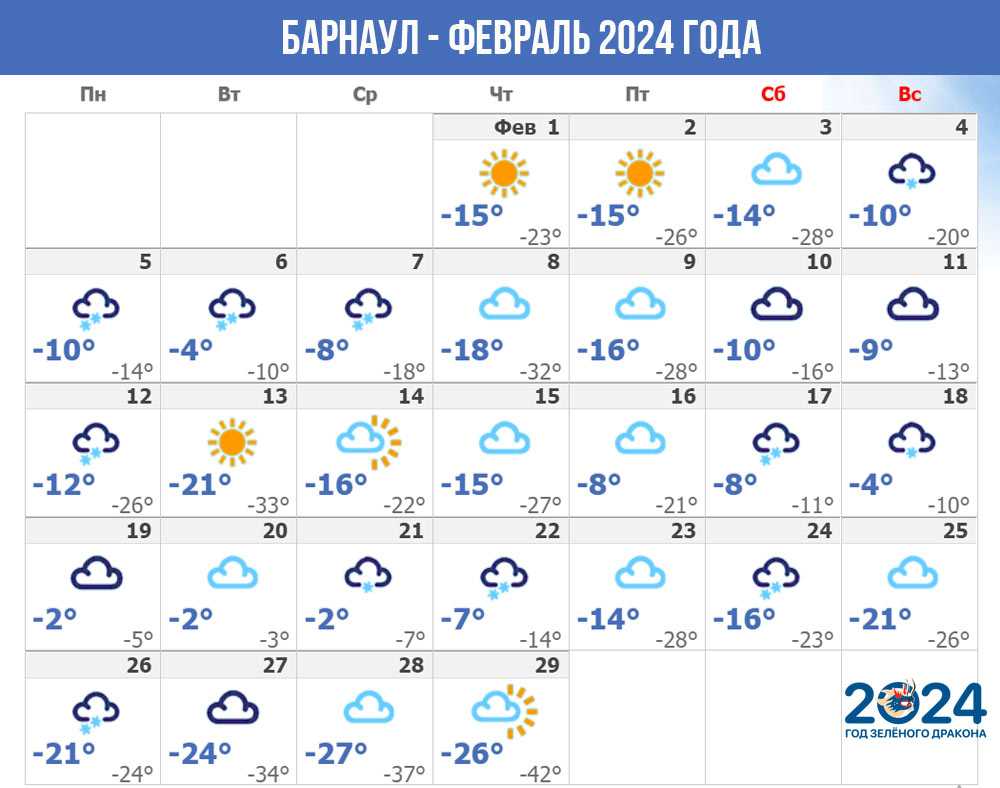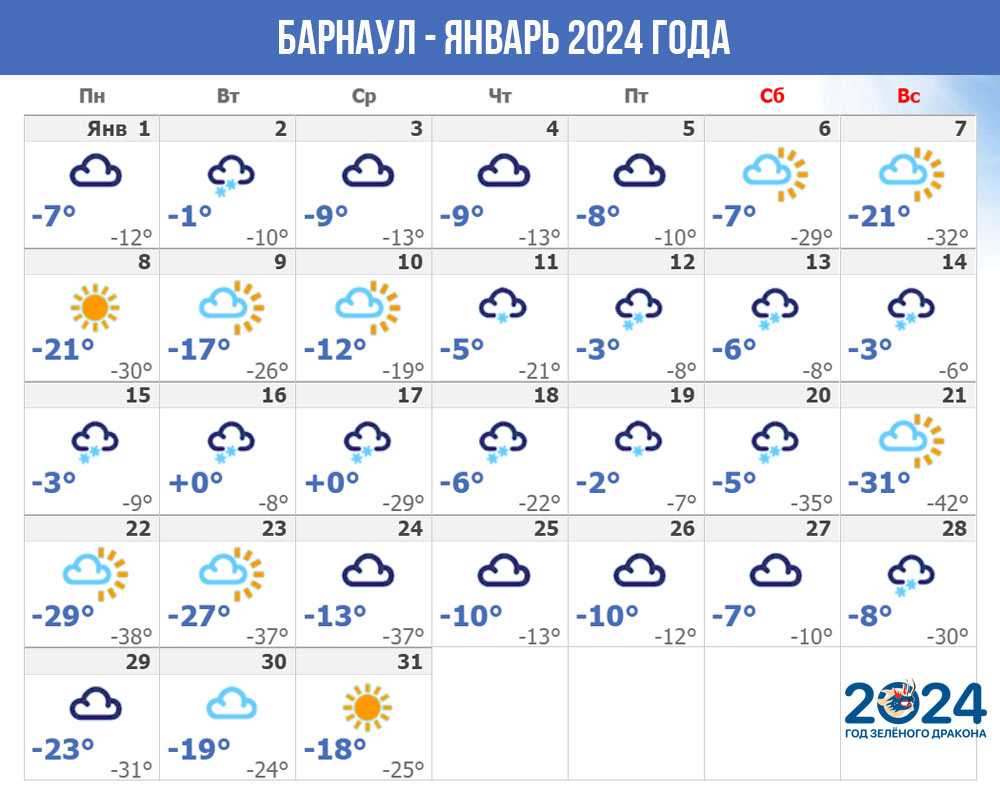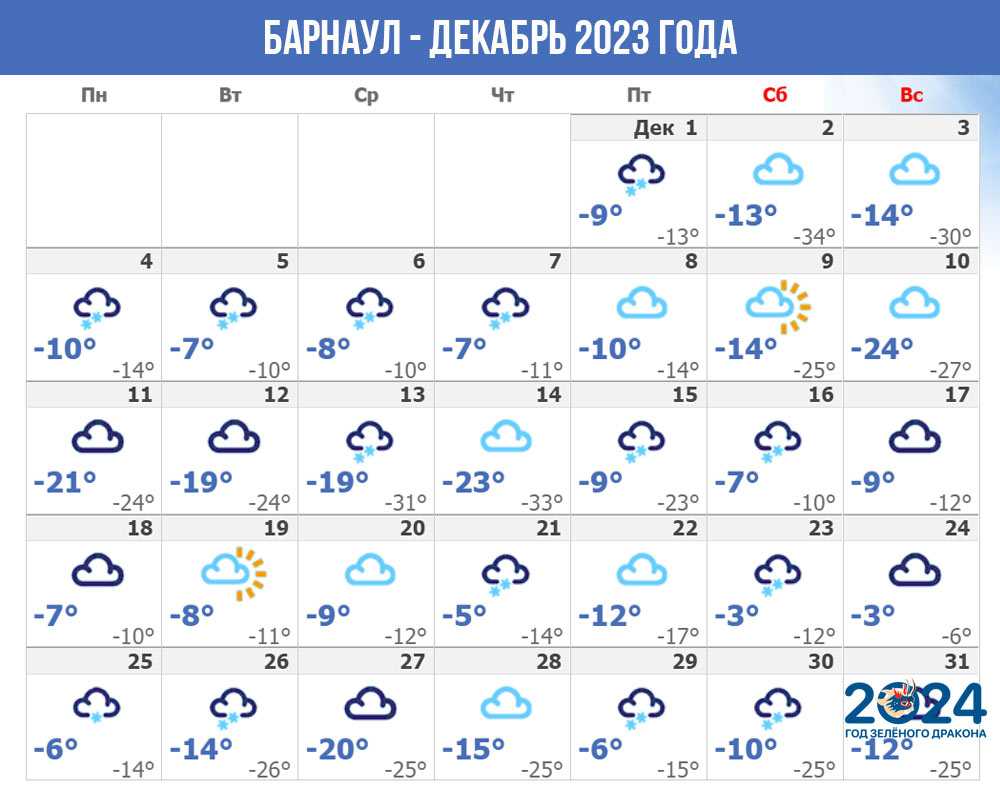 Первые дни 2024 года порадуют небольшим потеплением, но уже с 7 января в Барнауле ожидается очередное похолодание с ночными температурами ниже -30℃.