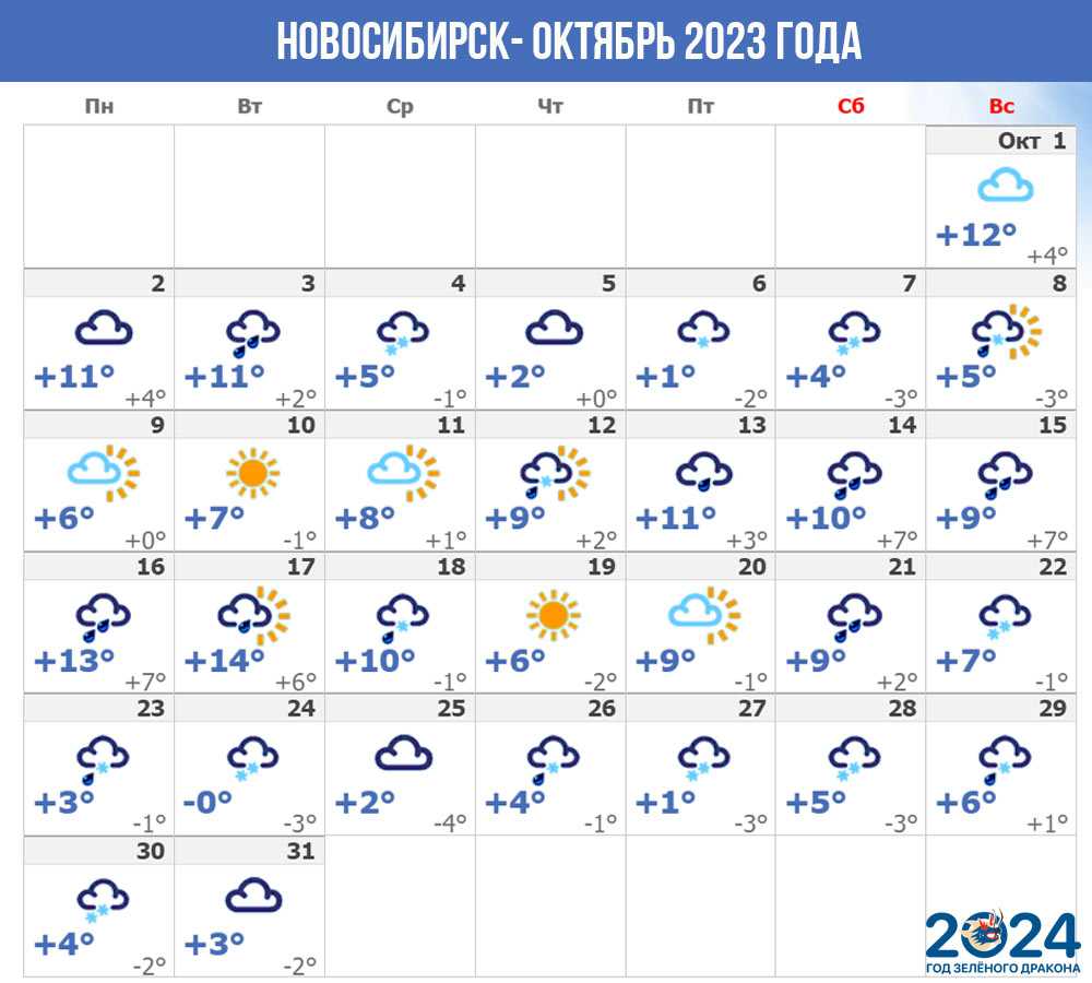 Первые заморозки придут в Новосибирск до 10 октября, что является климатической нормой региона. Но в целом погода октября будет достаточно теплой, с большим количеством осадков в виде дождя и мокрого снега, а также короткими ночными морозами, которые в дневные часы будут уступать место плюсовым температурам.