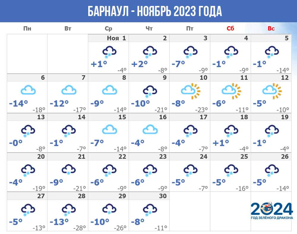 Первый снег и заморозки в Барнауле ожидаются уже во второй половине октября, а в ноябре установится по-настоящему зимняя погода с достаточно сильными ночными морозами и относительно комфортной погодой в дневное время.